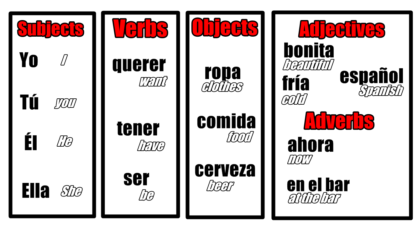 So you will follow a structure similar to the picture above. All subjects, verbs, adjectives etc. come in separated lists in the set of words you’re given, always with the English translation next to it. Try it for yourself and make your first sentences in Spanish: