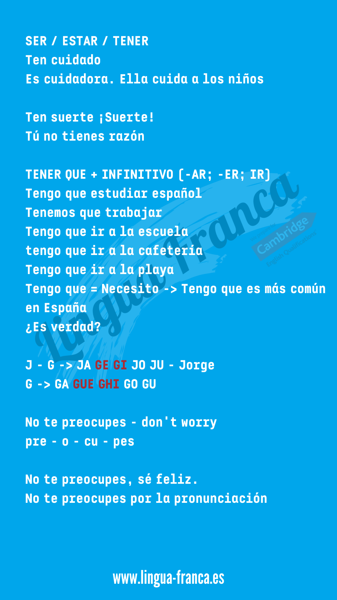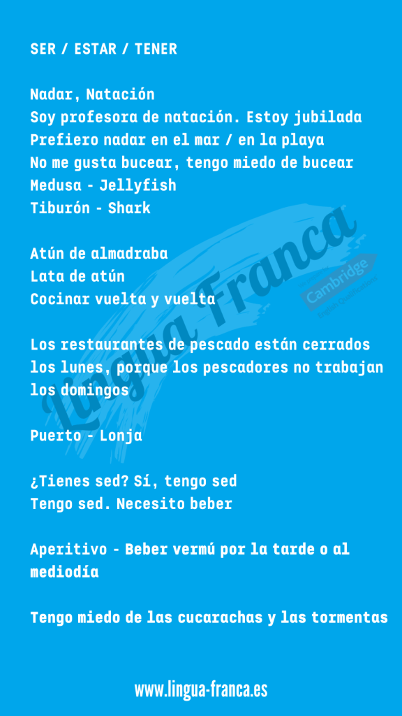 Spanish Coffee 30 Septiembre Posted byLingua FrancaSeptember 30, 2021Posted inSpanish Club, Spanish Coffee Nuestra lección de hoy: TENER, ESTAR y SER y REPASO SER y ESTAR