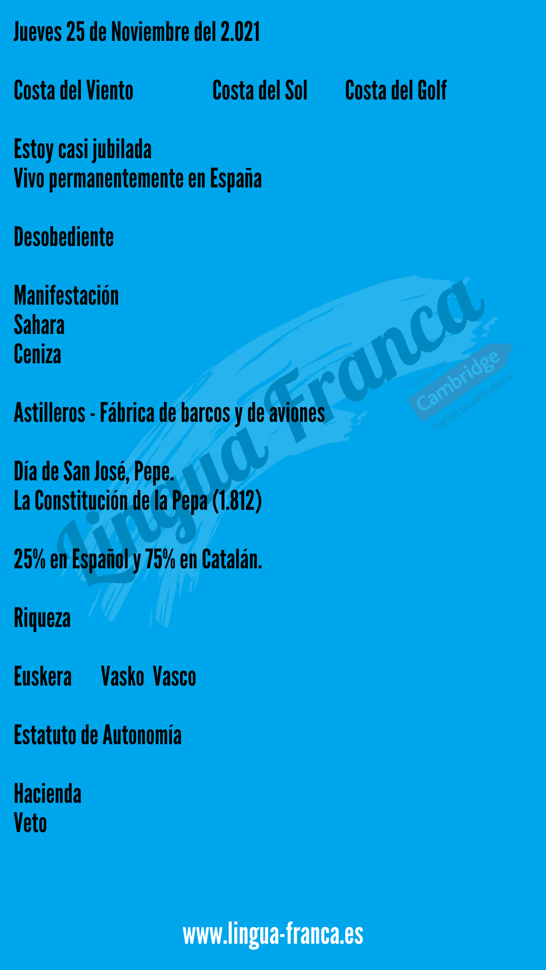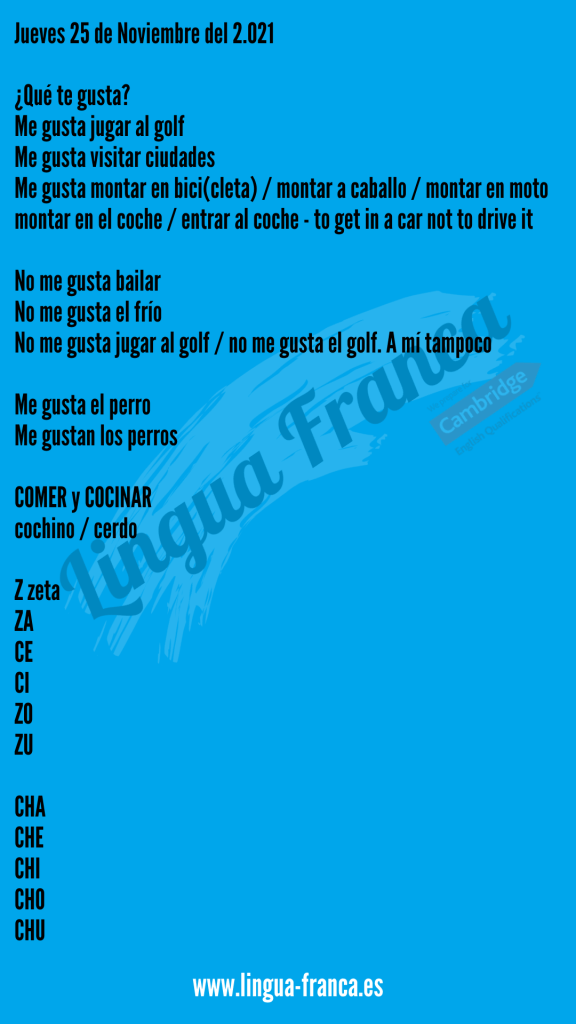 Spanish Coffee 25 Noviembre 2021 Posted byLingua FrancaNovember 25, 2021November 25, 2021Posted inSpanish Club, Spanish Coffee Clase 10 am ¡Una clase fantástica! AQUÍ está la lección Clase 12:00