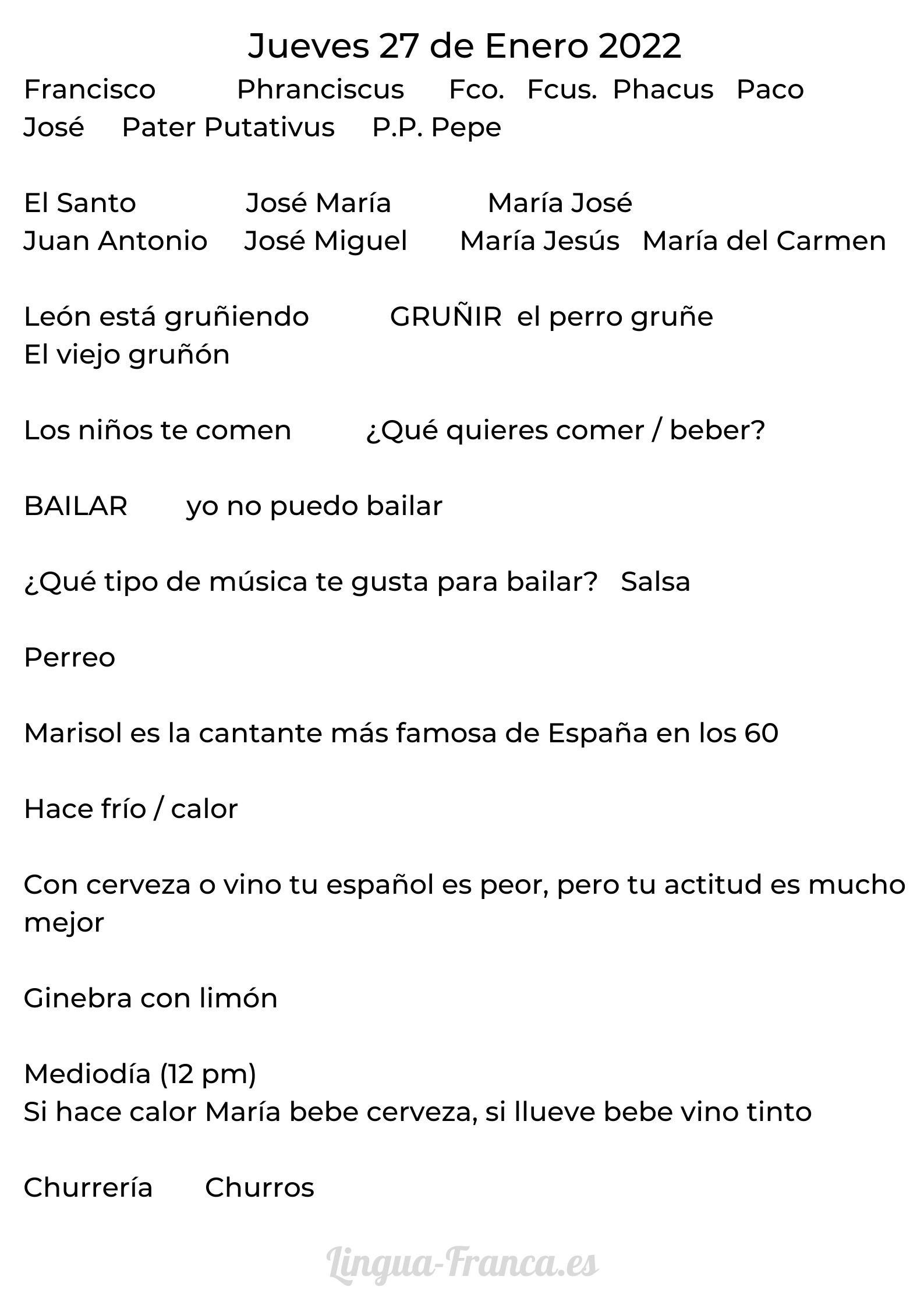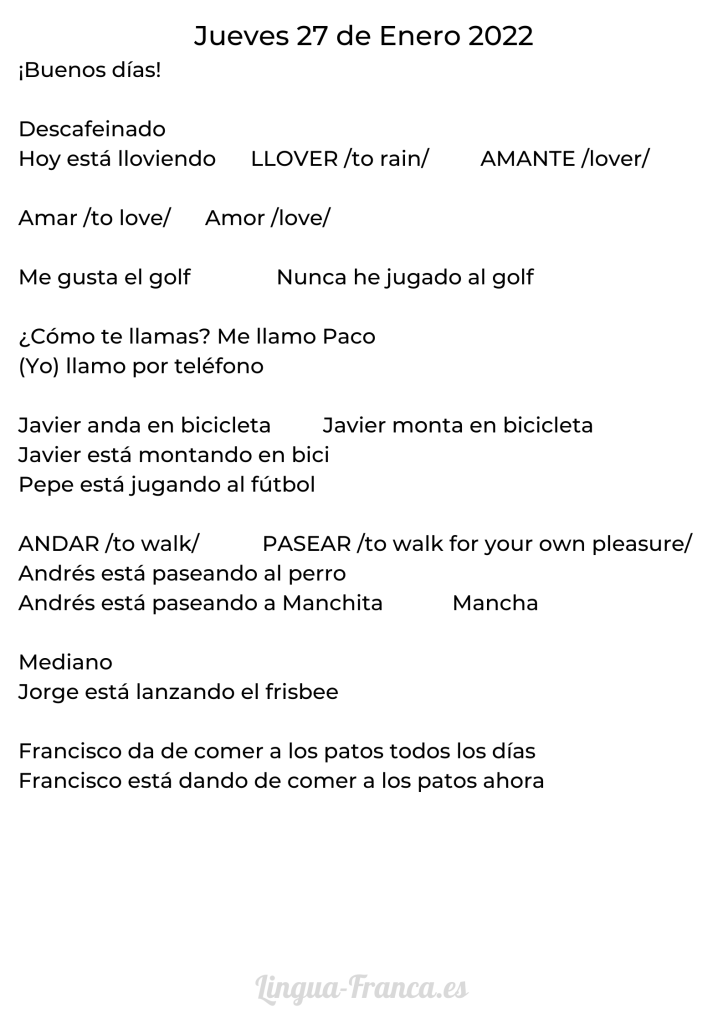 Spanish Coffee, 27 de Enero 2022 Posted byLingua FrancaJanuary 27, 2022Posted inUncategorized ¡Hoy hemos tenido una clase fantástica! La lección está AQUÍ.