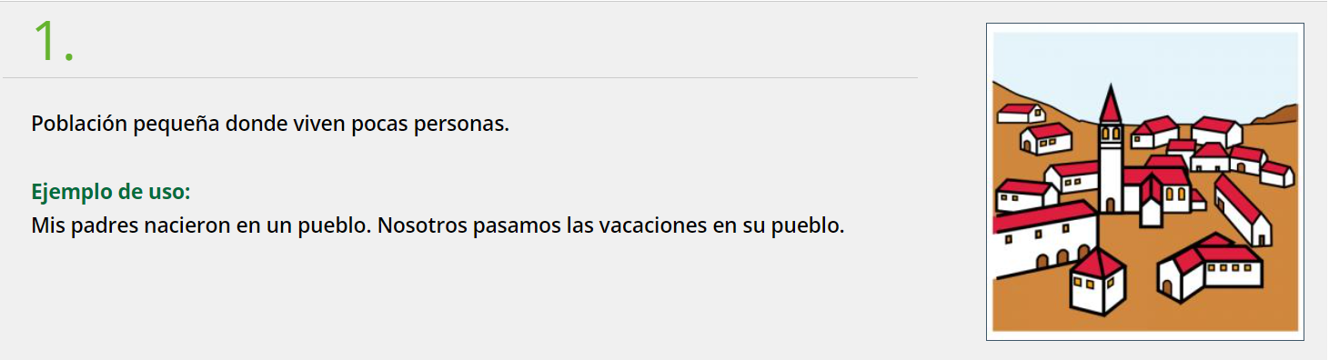 Se llama Diccionario Fácil, y es un sistema muy fácil para aprender español sin usar inglés. Vamos a buscar la palabra ‘PUEBLO’