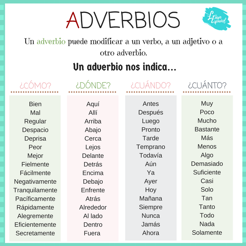 La semana pasada estudiamos los adjetivos, palabras que describen nombres. Esta semana vamos a completarlo con los Adverbios, que son palabras que describen verbos.