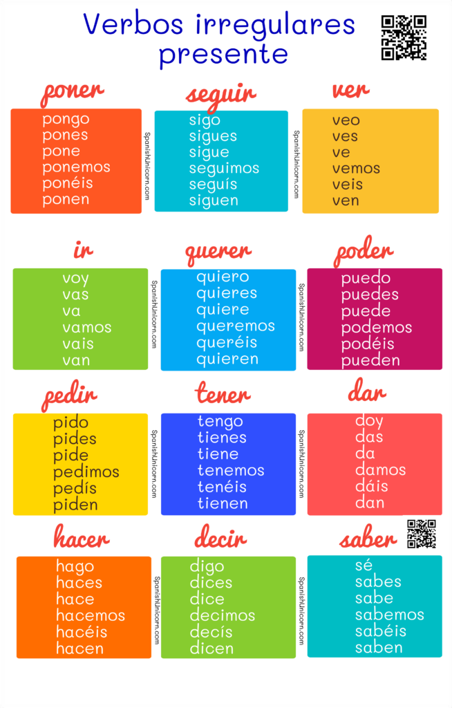 - Poder: puedo, puedes, puede, podemos, podéis, pueden.