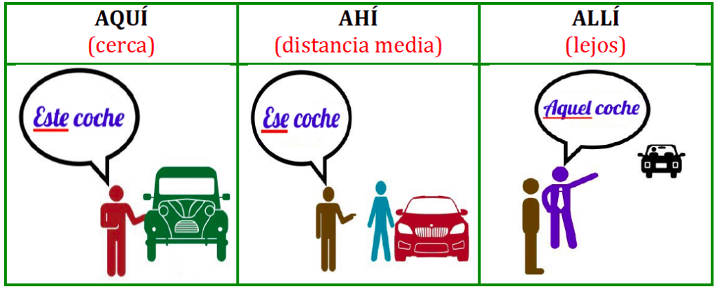 Para ilustrar este concepto, mira la foto de los tres coches: uno verde que está cerca de nosotros, uno rojo que está un poco más lejos pero aún podemos ver y uno negro que está al final de la calle y no podemos ver claramente. Podríamos decir: “Este coche verde está muy cerca“, “Ese coche rojo está un poco más lejos” y “Aquel coche negro está al final de la calle“.