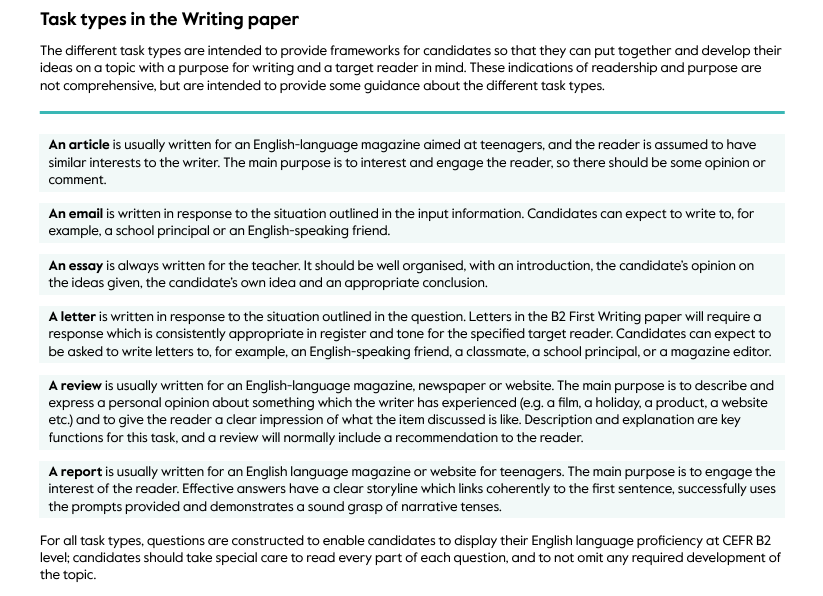 En el B1 hay tres tipos solamente. Contestar un mail, escribir una redacción (essay) o inventar una historia que empiece por una frase dada.