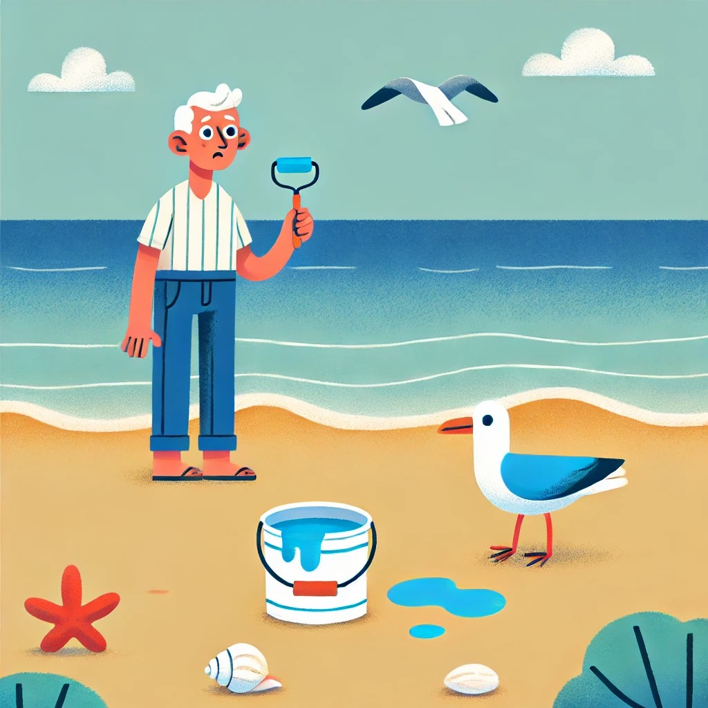 José caminaba por la playa cuando vió una gaviota de color azul. El pájaro era azul porque se cayó a un cubo de pintura.