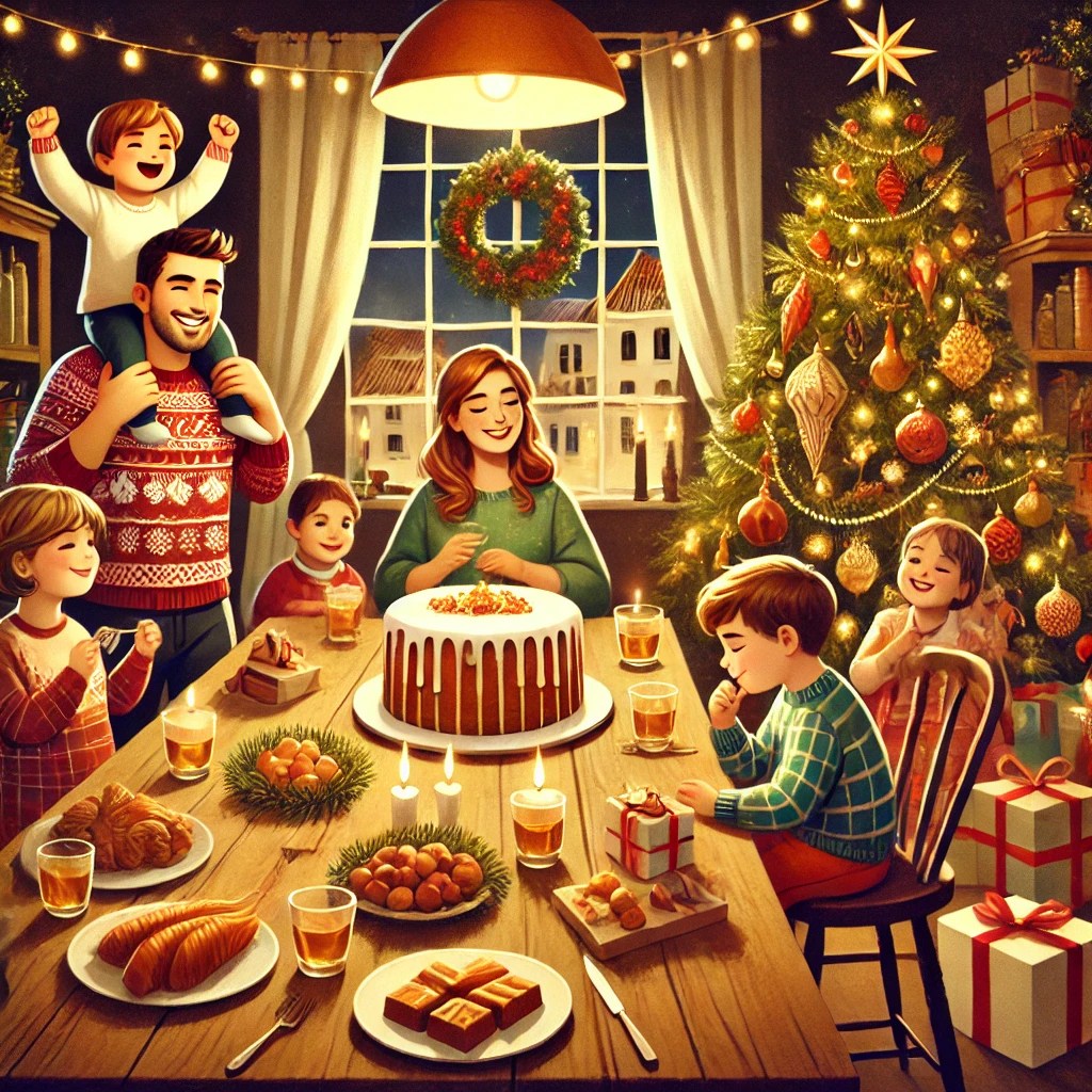 El 24 de diciembre celebramos la Nochebuena. Las familias se reúnen en casa para cenar. Comemos platos muy ricos como marisco, cordero o pescado. También comemos dulces típicos: turrón, mazapán y polvorones. Es un momento para estar juntos y compartir.