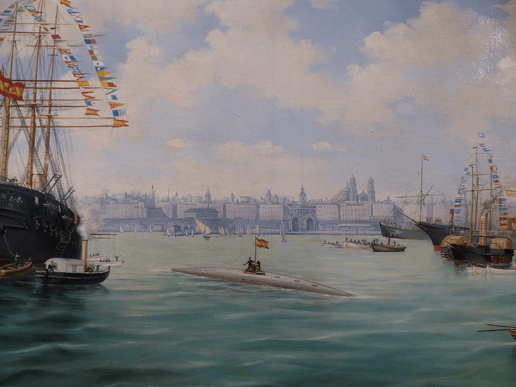 En 1888 (mil ochocientos ochenta y ocho), Isaac Peral construye el primer submarino eléctrico. Su invento tiene baterías, torpedos y puede moverse bajo el agua sin problemas. Es el origen de los submarinos modernos.