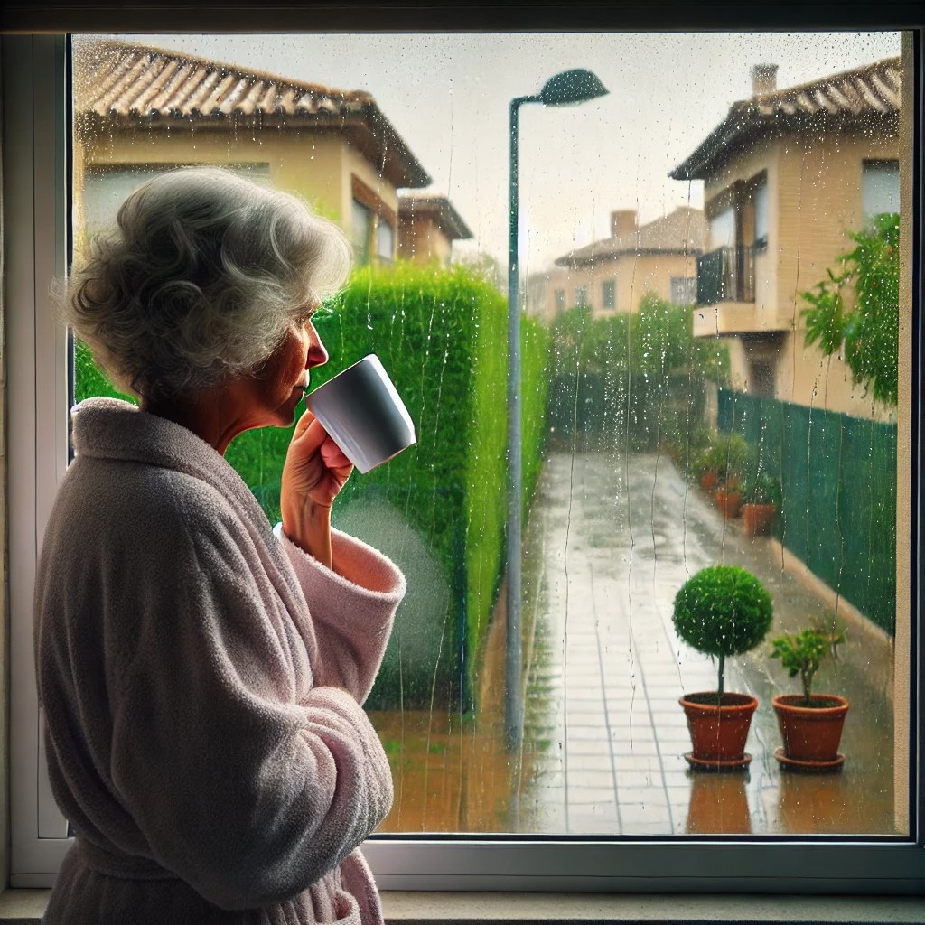 El lunes, el cielo estaba completamente gris y las calles se llenaron de charcos. Mientras tomaba un café, miraba cómo el viento movía los árboles con fuerza. Normalmente, los lunes iba a caminar por el parque, pero esta vez preferí quedarme en casa.