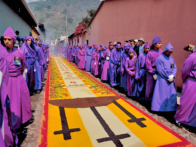 En Guatemala, las ciudades coloniales como Antigua se transforman. La gente ha creado alfombras de colores con aserrín*, flores y arena en las calles, diseñadas con tanta precisión que parecen obras de arte. Se preparan durante horas, incluso días, y los pasos de las procesiones las destruyen al pasar. Pero ese momento, lejos de doler, se considera una parte esencial del ritual: todo es efímero, como la vida.