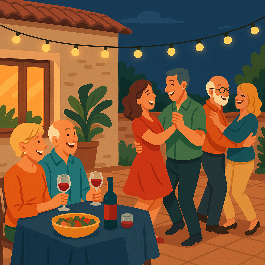 A las siete de la tarde, llegan los primeros amigos. Tomamos una copa de vino blanco, charlamos y escuchamos música suave. Luego, a las ocho, cenamos juntos en la terraza. Cada persona trae un plato: una ensalada, una tortilla, una tarta…