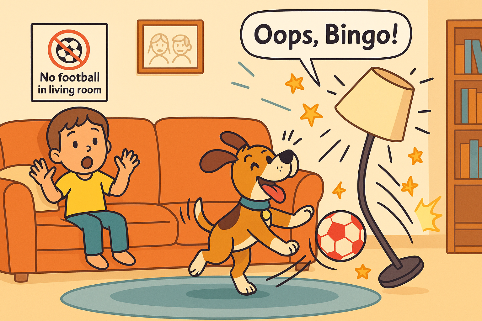 My house has rules. In the living room, we can read and draw, but we can’t play football. There is a big sofa and a tall lamp. Bingo, my naughty dog, kicks a ball and bumps the lamp—oops!