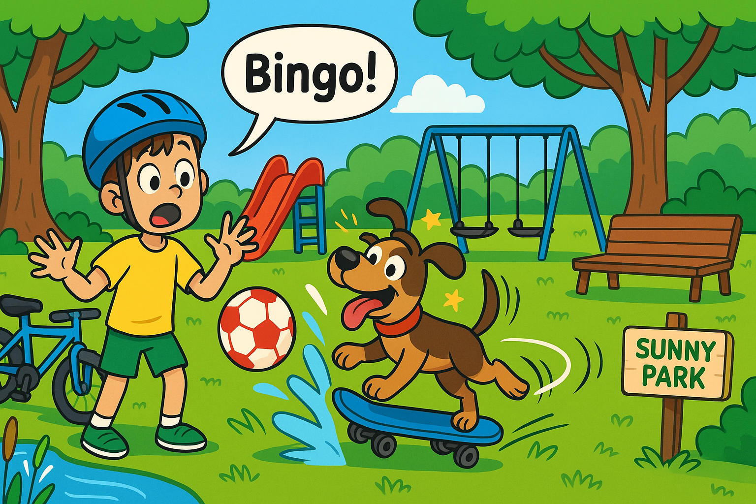 We can play football on the grass. Bingo can jump and catch the ball. He tries my skateboard—wobble, plop! He can’t ride it. I can’t skate yet, but I can kick the ball to him. Bingo can’t climb the slide ladder, so he waits and barks. We laugh together.