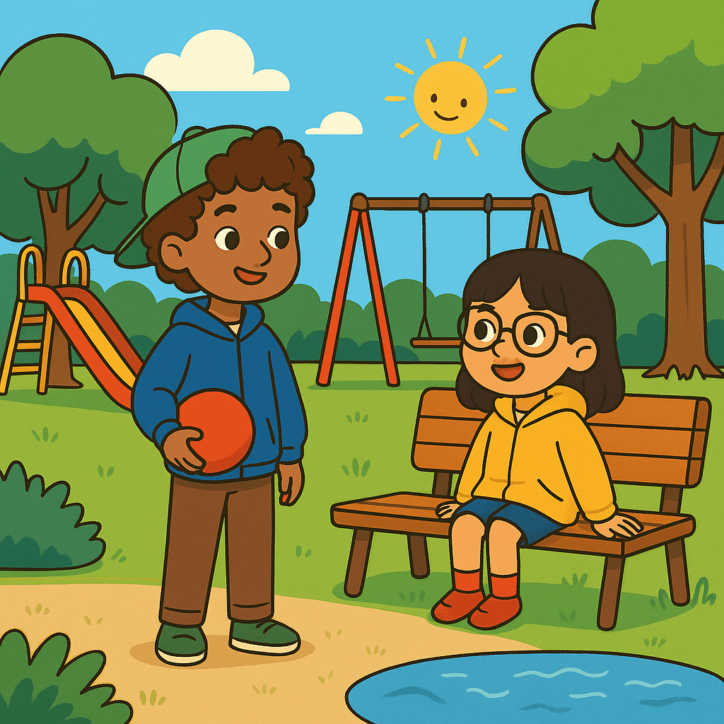 They are in Sunny Park after school. There is a long bench and a slide. There are two swings under the tall trees. The sun is warm. Noah is holding a ball. Zara is smiling. They are good friends. There is a small pond near the bench. They are taking turns on the swings.