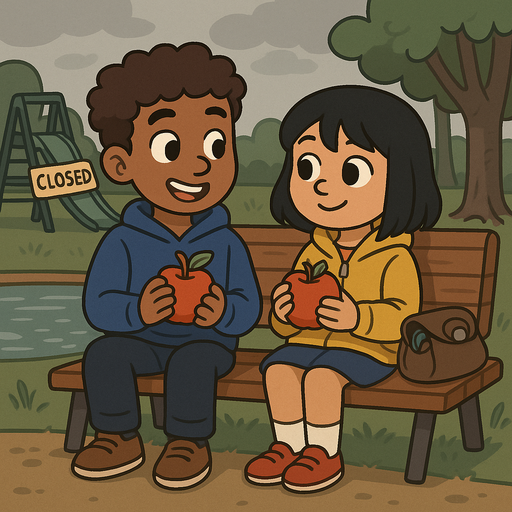 She hasn’t got her glasses on; they are in her bag. There aren’t many children in Sunny Park. The slide isn’t open, so they aren’t playing on it. The swings aren’t busy. Noah and Zara are sitting on the long bench near the small pond. They aren’t sad; they are talking quietly and eating apples.