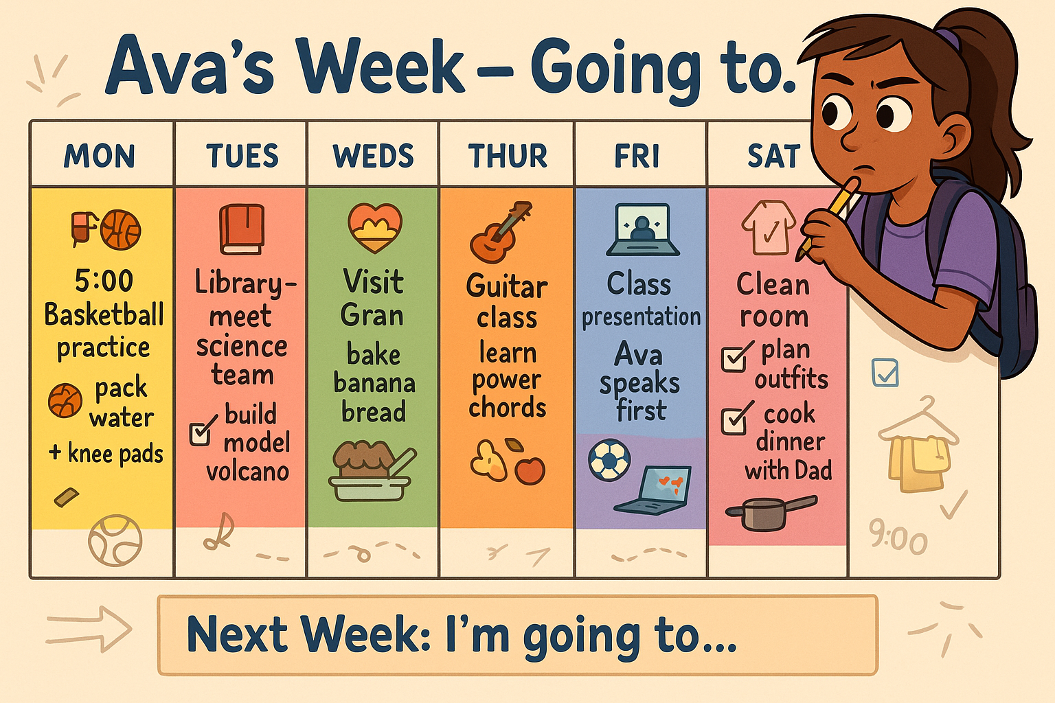 Saturday morning the team is going to play a friendly match. The other side looks tired, so Ava thinks they’re going to win. In the afternoon she’s going to video-call her cousin in Canada. On Sunday she’s going to clean her room, plan outfits for the week, and cook dinner with her dad. She isn’t going to stay up late because Monday is going to be busy again.