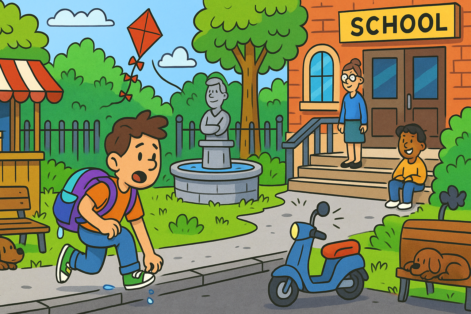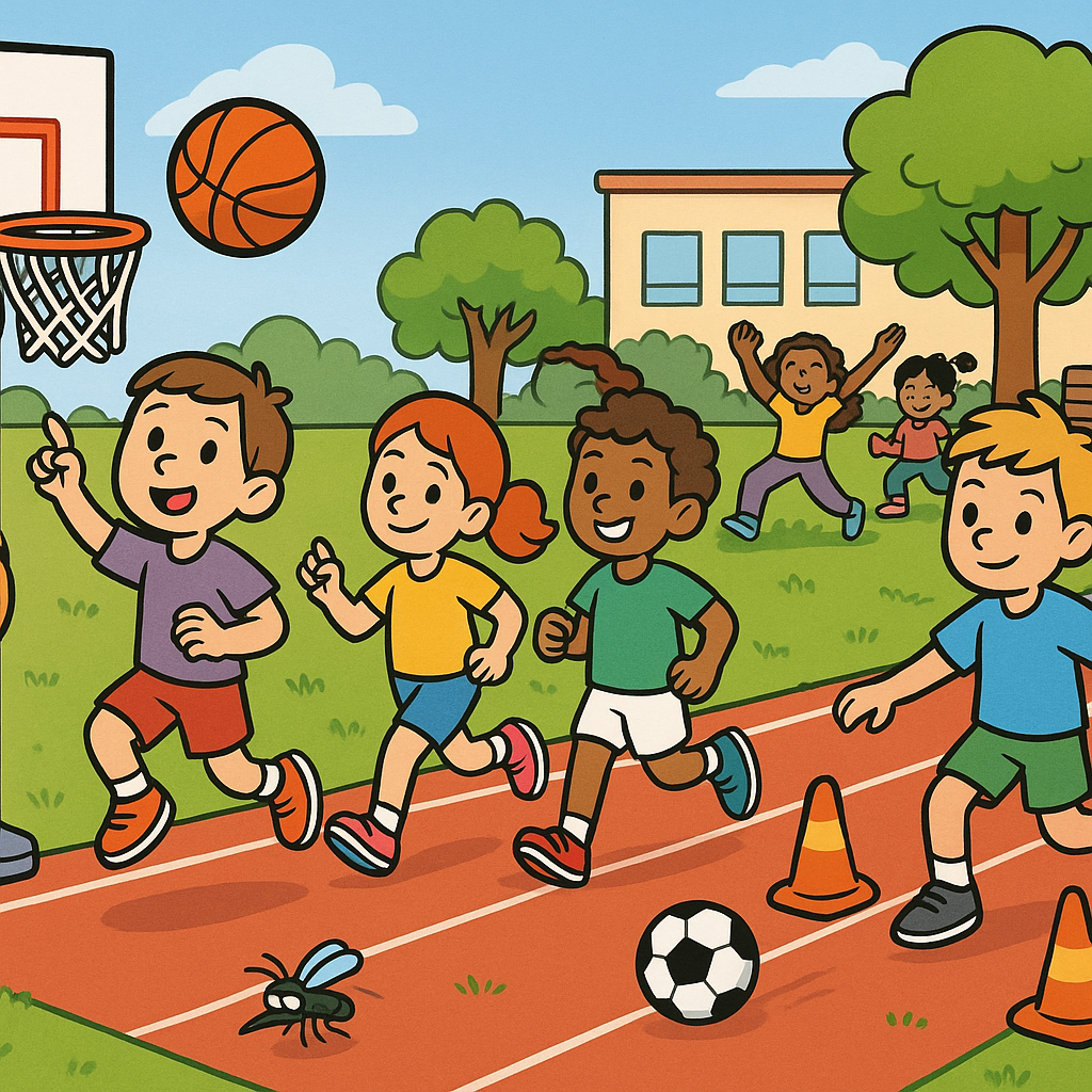 I love sports at school. On Mondays we play basketball in the yard. I stand in front of the hoop and try a shot. My friend Leo waits behind me and counts, “Three, two, one!” On Tuesdays we run on the track. I run next to Mia. She is fast, but I smile and keep going. On Thursdays we play football. I kick the ball between two cones as a goal. Our coach is on the left; the bench is on the right. We always stretch in the gym after games. Sports make me strong and happy, and I sleep well at night.