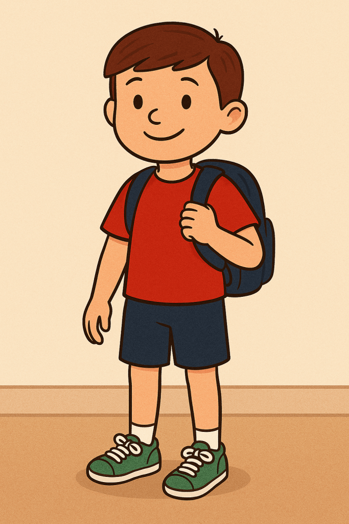 For school, I wear my grey trousers, a blue jumper, and my black shoes. My backpack is heavy, but I’m strong!When I do sports, I wear my green T-shirt, black shorts, and my sports shoes. I play football with my friends every weekend.