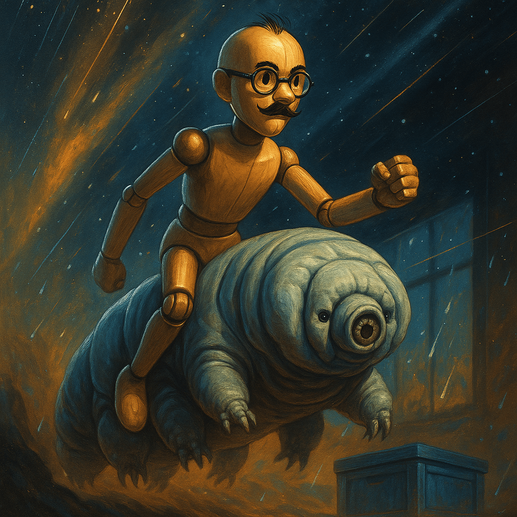 Charlie started his trip. The floor felt cold and huge. A drop of water rolled from a boot and made a pond. Inside it, tiny tardigrades floated. They helped him. One friendly tardigrade bent its little legs, and Charlie climbed on. He rode it like a horse. They crossed the pond, pushed a pencil bridge, and reached Paco’s box.