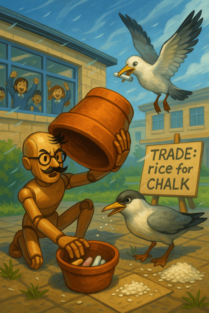 We followed a dust trail to the hall. A seagull was pecking the white pieces outside and was shaking its head like a drummer. Charlie chose a bright idea: he fed the bird some rice from lunch while I wrote a big sign: “TRADE: rice for chalk.” The seagull took the deal. It brought three sticks back and hid the rest under a flowerpot.