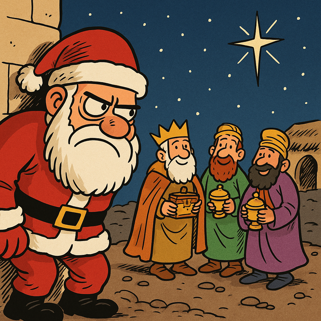 Cada año, los Reyes Magos están más preocupados. Papá Noel llega antes, ocupa las calles con sus luces y hasta reparte los regalos antes que ellos. “¡Nos está quitando el trabajo!”, murmura Melchor mientras Baltasar asiente con cara seria. Pero en el fondo saben que la verdadera batalla es en el corazón de los niños…