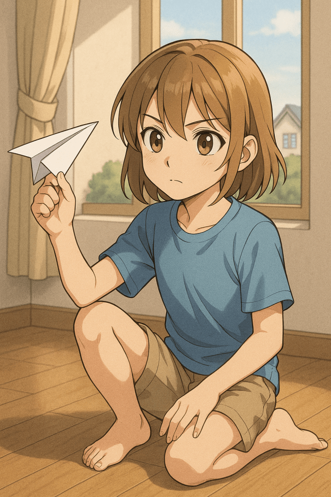 Tina’s science club is holding a “flight challenge.” Her paper planes always drop fast. She tries heavy paper, but it bends. She asks her brother, and he says to check the folds and the wings. Tina finds a short tutorial channel with slow, clear steps. She sets up her desk, gets thin A4 paper, and pauses after each step to copy it. She tests the plane in the hallway and measures the distance with tape.