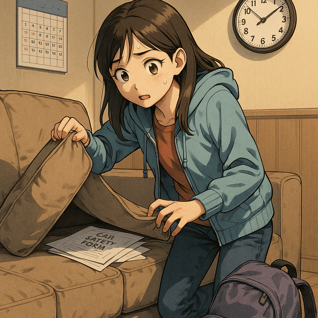 Mei must bring a signed safety slip for the lab demo. She put it somewhere in her room after school. The teacher said only students with the slip may enter the lab. Mei checks her desk, bag, and books, but it isn’t there. Then she remembers: she studied on the sofa. She runs to the living room and looks under the cushion. She still has twenty minutes before she leaves.