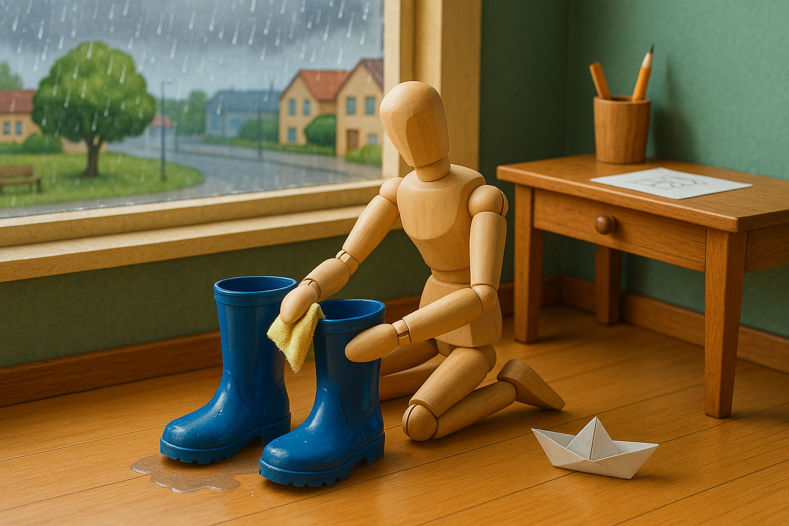 “It’s raining now,” he thinks. “Later, I’m going to make a plan.”