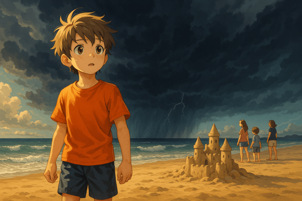 Ben and his cousins are at the beach on a hot Sunday. They build a big sandcastle near the sea. Suddenly, dark clouds appear and the wind gets stronger. Ben’s mum says, “If the storm comes here, we will leave the beach and go to the café.” The children look at the sky and wait for the first raindrops.
