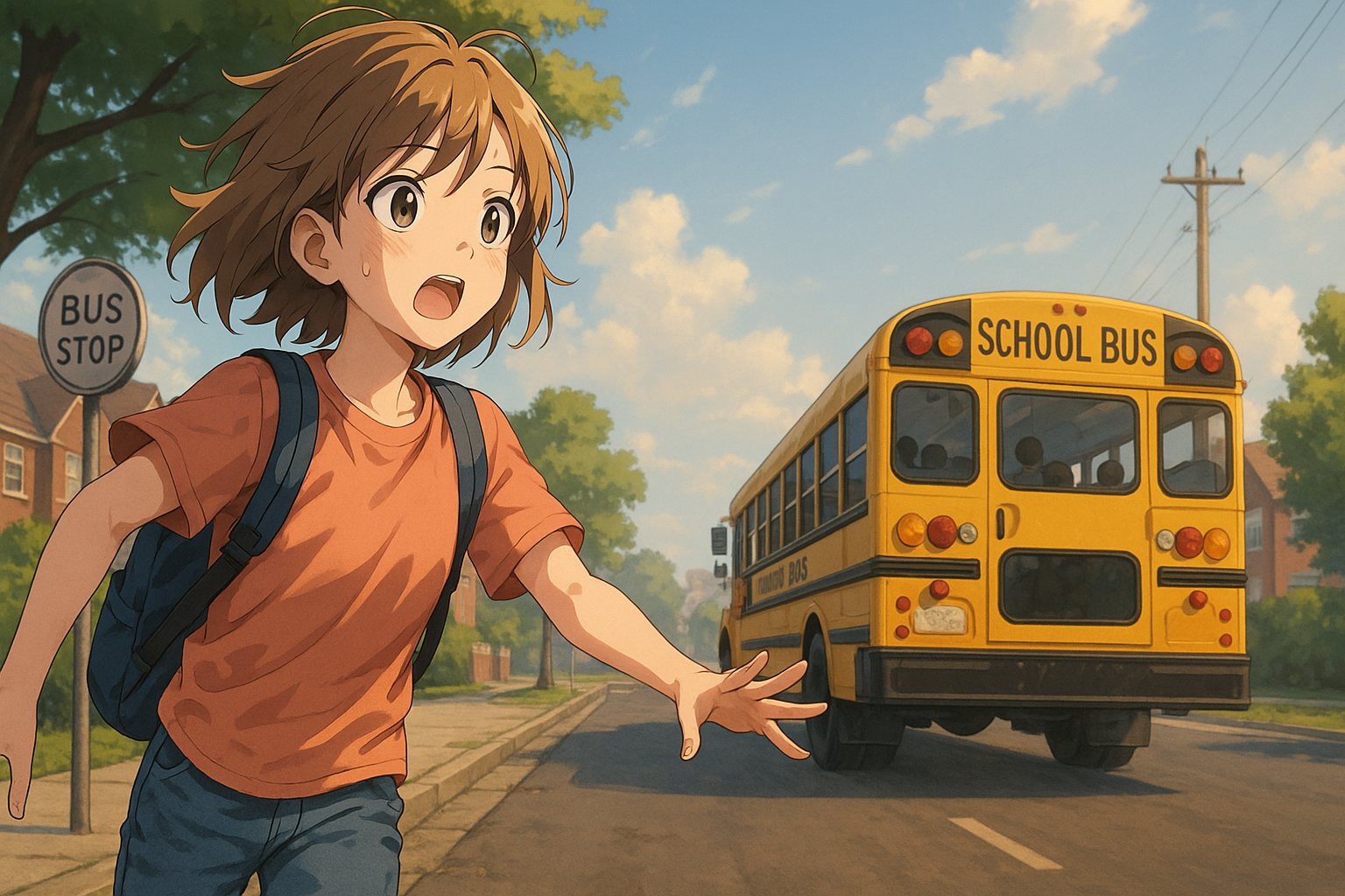Emma wakes up late on Monday morning. She runs to the bus stop, but the school bus is already leaving. She is worried because there is a science test today. Emma thinks, “If I miss this test, I will have to do it after school.” She decides to walk quickly to school and study on the way.