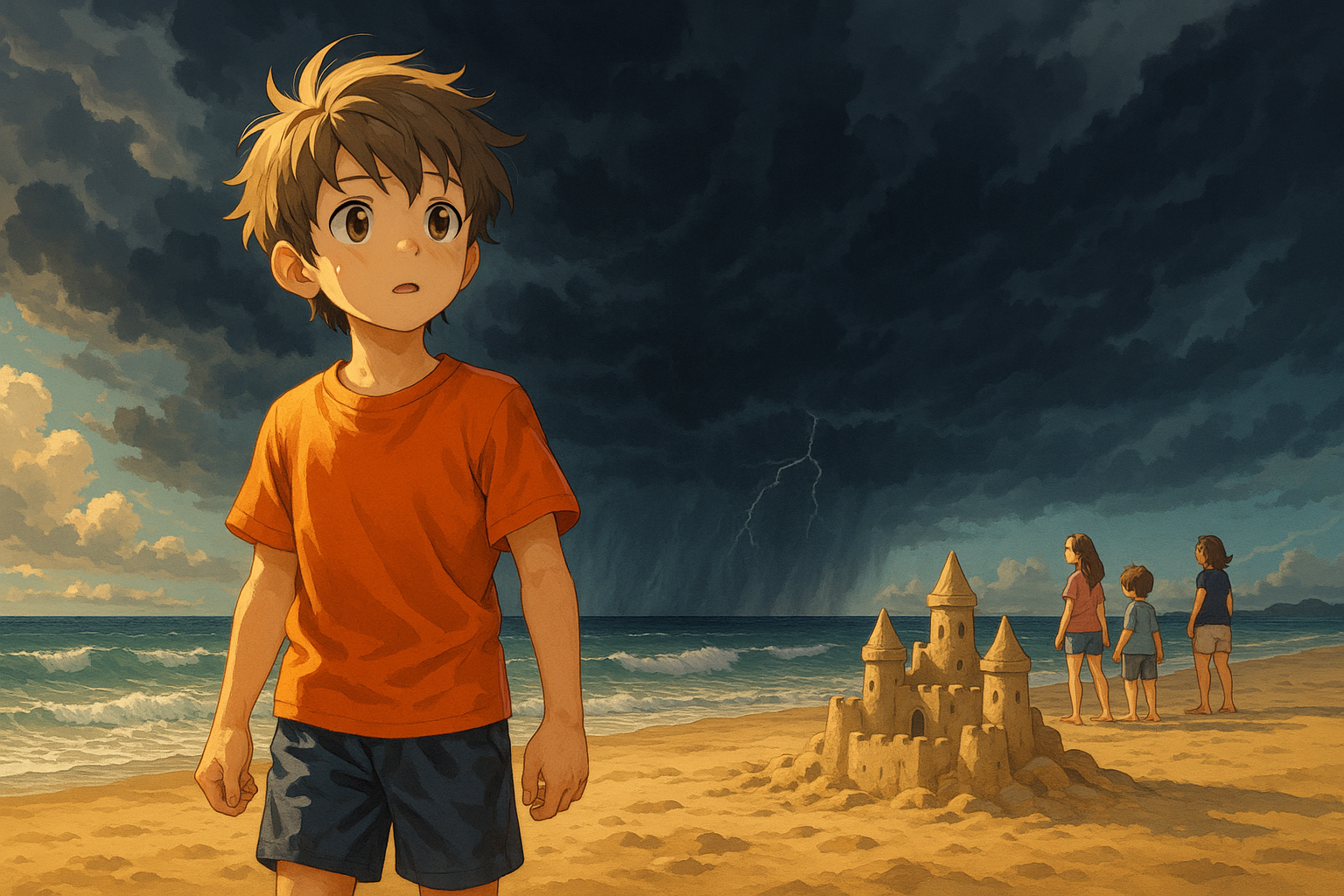 Ben and his cousins are at the beach on a hot Sunday. They build a big sandcastle near the sea. Suddenly, dark clouds appear and the wind gets stronger. Ben’s mum says, “If the storm comes here, we will leave the beach and go to the café.” The children look at the sky and wait for the first raindrops.