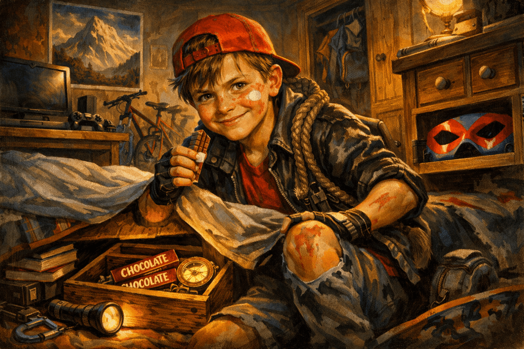 Now… the secret part. Under my bed there is a secret box. Inside, there are two chocolate bars and a tiny compass. In the secret drawer there is a superhero mask. But there aren’t any vegetables in my secret box. Vegetables are the real monsters