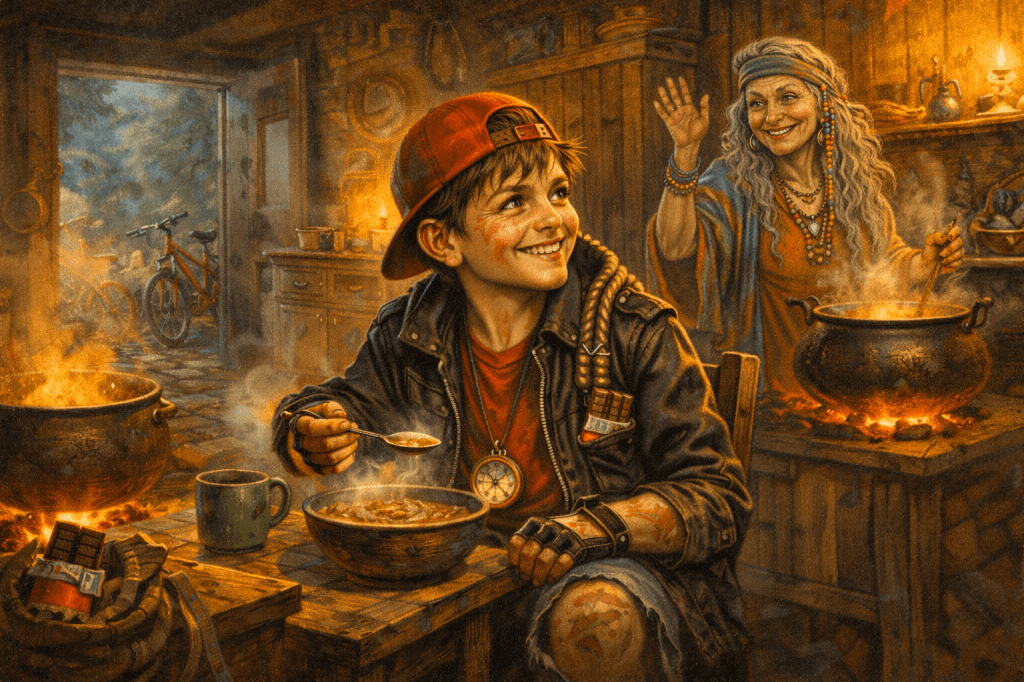 Inside the cottage there is warm soup. The lady listens and helps Tommy. She shows him the way back to town. Later, Tommy finds his friends and says, “I survived on my own!” His friends are shocked. Tommy grins and says, “Because I’m Adventure Tommy, that’s all!”