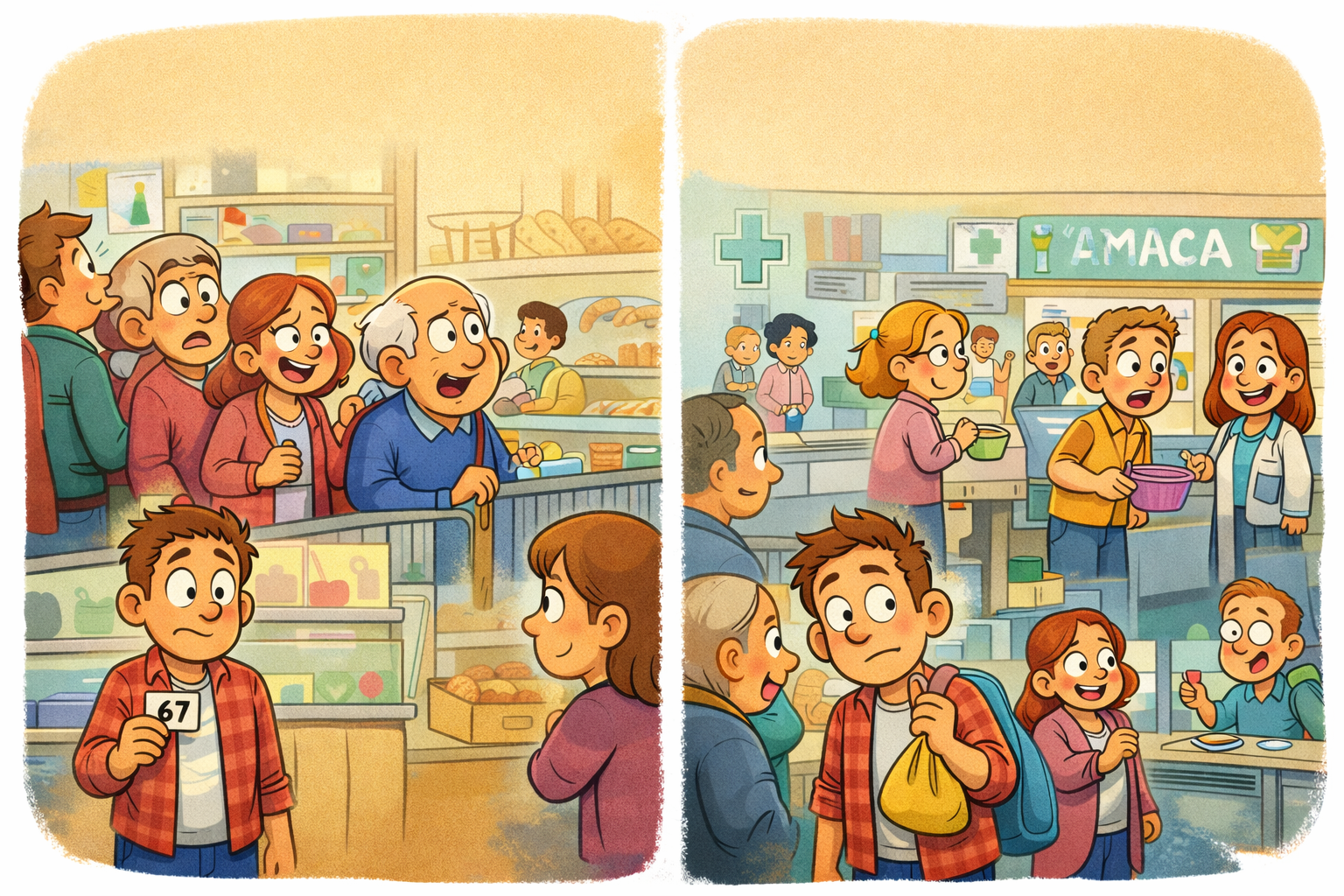 Yo estoy esperando y miro el mostrador. La dependienta está trabajando muy rápido, pero la cola no se mueve. De repente, alguien pregunta: