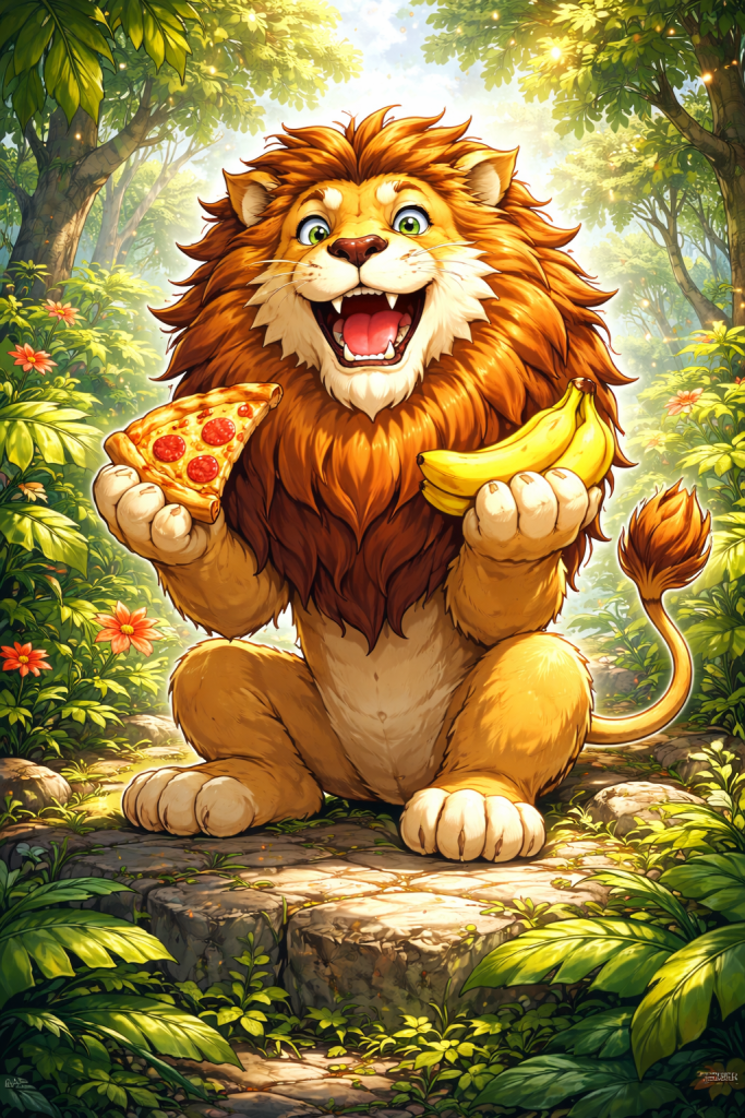 Can the lion eat bananas and pizza? 🍌🍕