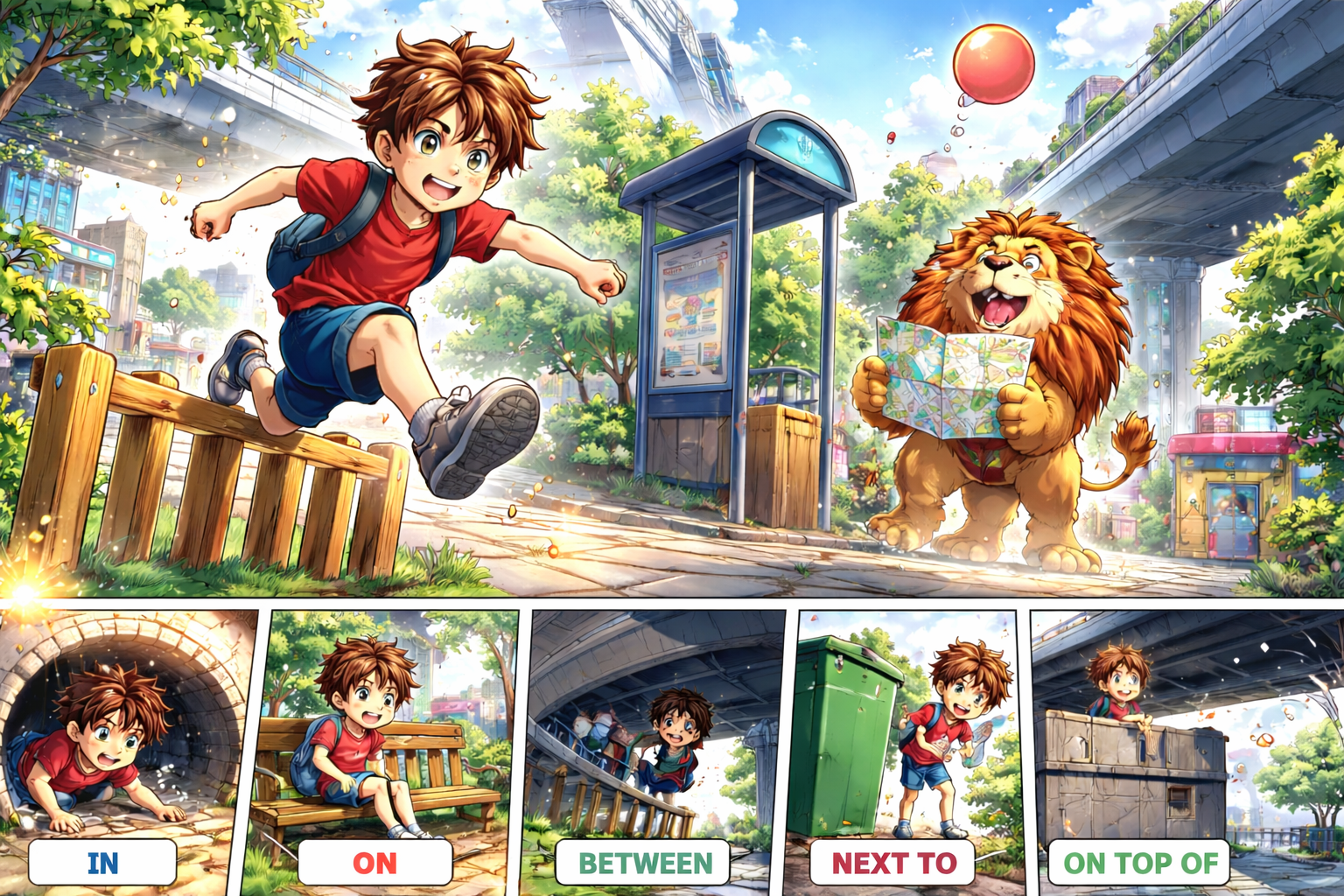 The lion stops next to the bus stop and checks a map 🤔. The boy slides under a bridge and crawls through a tunnel.