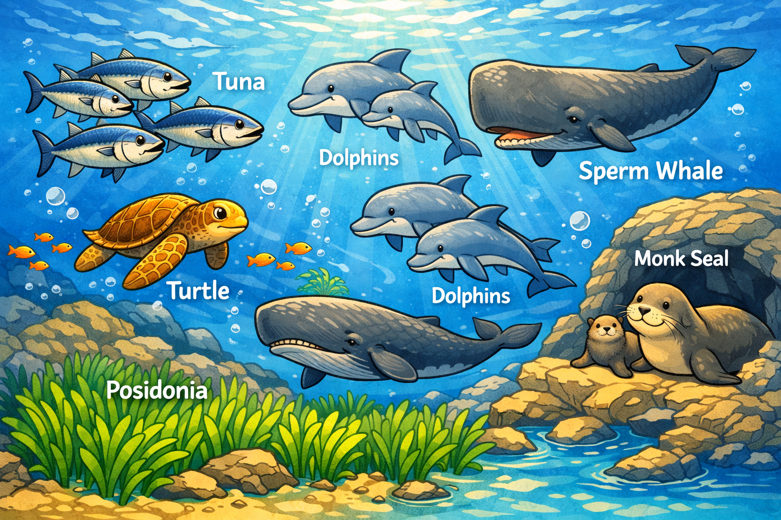 Under the water grows Posidonia seagrass, a green “forest” that makes oxygen, protects the shore, and is a nursery for many young fish.
