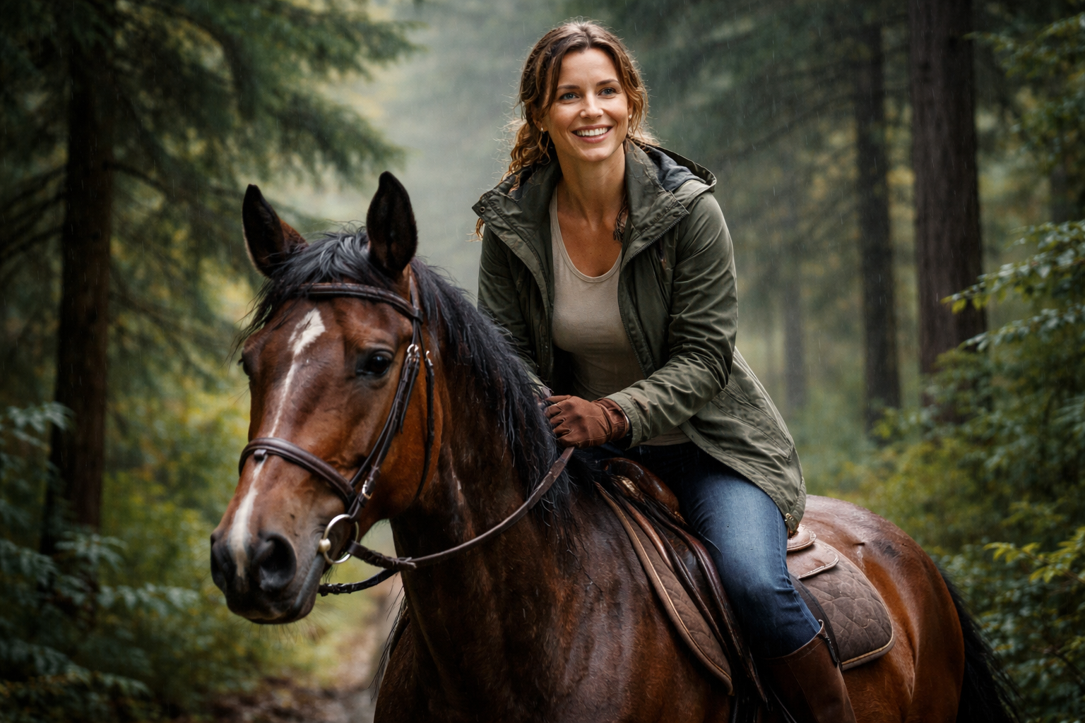 I met a friend at a small riding place and we rode horses into the trees. The paths were muddier than I expected, so we went slowly at first. Later, we found a longer trail that was safer and easier. My horse was stronger than the first one I tried, and I felt more confident. We took photos and we drank hot tea after the ride.