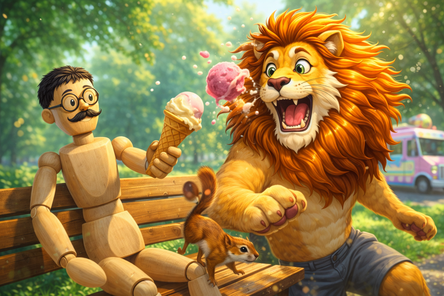 It bumped Charlie’s cone, and the scoop flew into Leo’s mane.