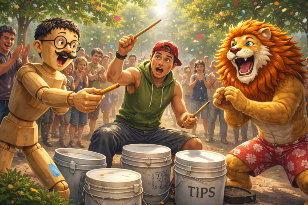 A drummer was playing buckets on the corner.