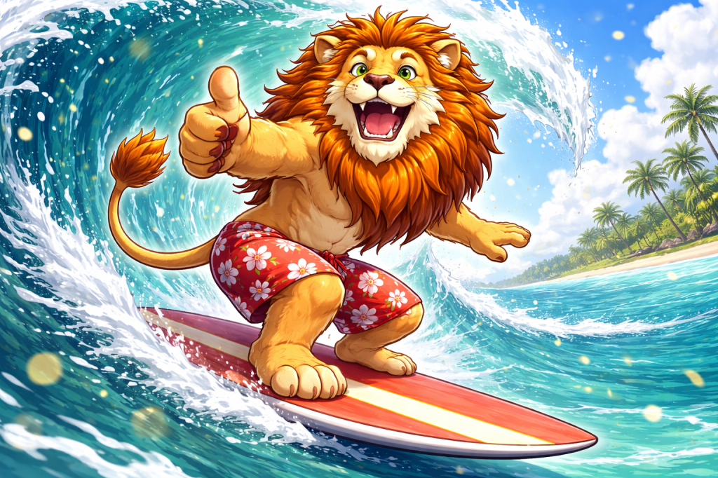 Leo the Lion loves our Mediterranean coast. At sunrise he grabs his board, because surfing wakes him up better than coffee. When a good wave rises, he paddles fast, stands up, and rides it like a moving road. He can feel the salt on his face and the wind in his mane.