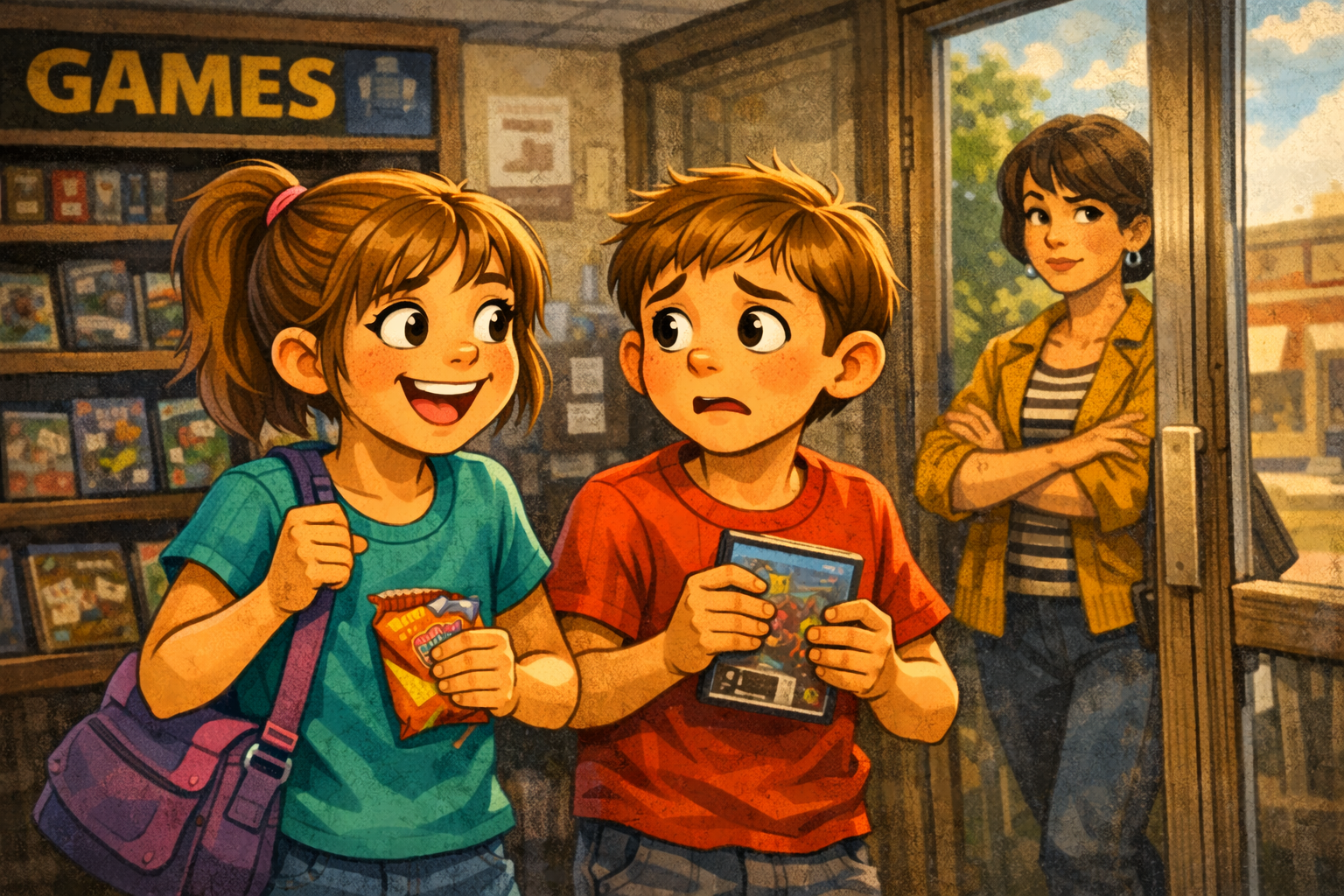 They got on a bus and went to the game shop. They looked around and bought some cheap snacks. Everything was fine—until Sam saw her mum’s friend near the door. The friend looked at them and asked, “Aren’t you at the library?”