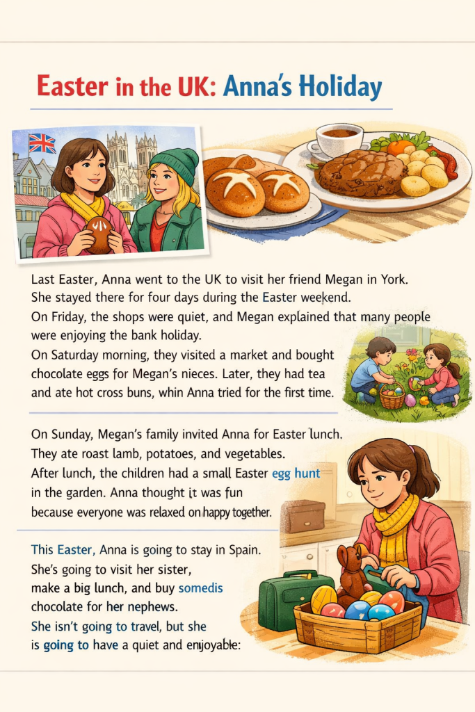 Last Easter, Anna went to the UK to visit her friend Megan in York. She stayed there for four days during the Easter weekend. On Friday, the shops were quiet, and Megan explained that many people were enjoying the bank holiday.