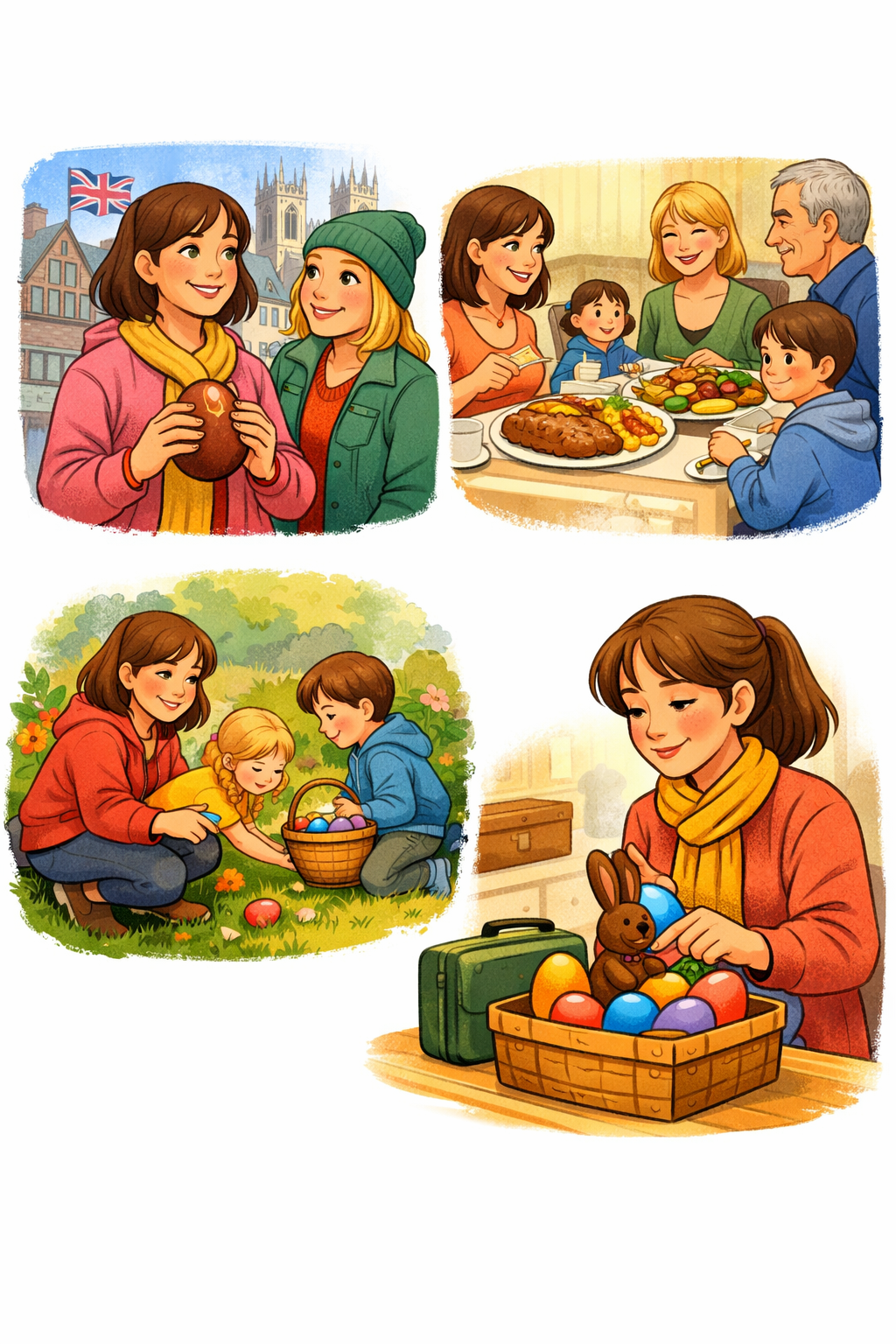 On Sunday, Megan’s family invited Anna for Easter lunch. They ate roast lamb, potatoes, and vegetables. After lunch, the children had a small Easter egg hunt in the garden. Anna thought it was fun because everyone was relaxed and happy together.