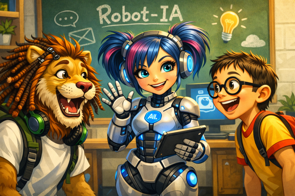 At the end, Robot-IA says, “Use AI to help you. Ask for ideas. Ask for examples. Do not use AI for every answer.” Leo and Charlie smile. They are ready to learn.