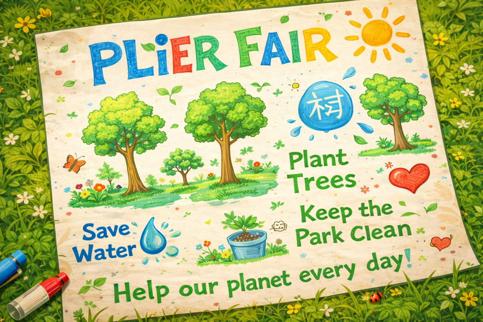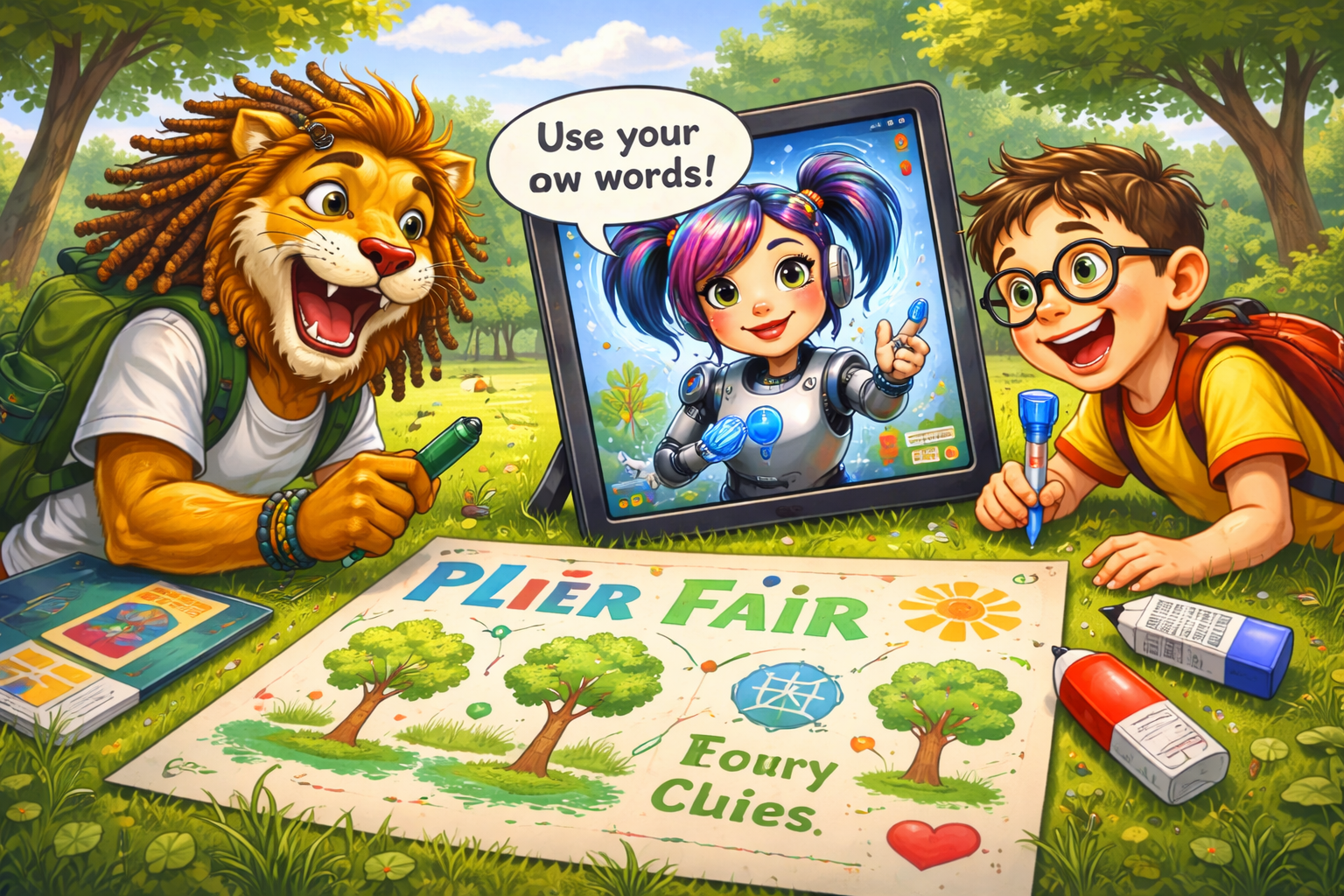 On Saturday, Leo and Charlie are in the park. They want to make a poster for the school eco fair. They have paper, pens, and glue, but they do not know what to write. Leo says, “Think of a good title!” Charlie says, “Don’t worry, we can do it!”