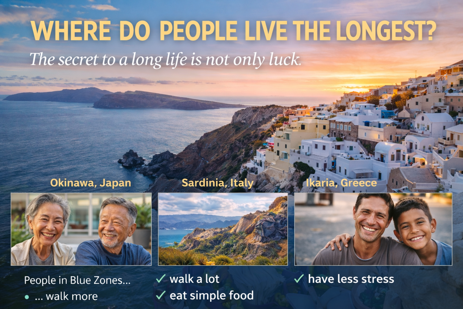 Why do people live longer there? Experts often say the same things: people walk a lot, eat simple fresh food, spend time with family and friends, and have less stress. A long life is not only about luck. Healthy daily habits can make a real difference.