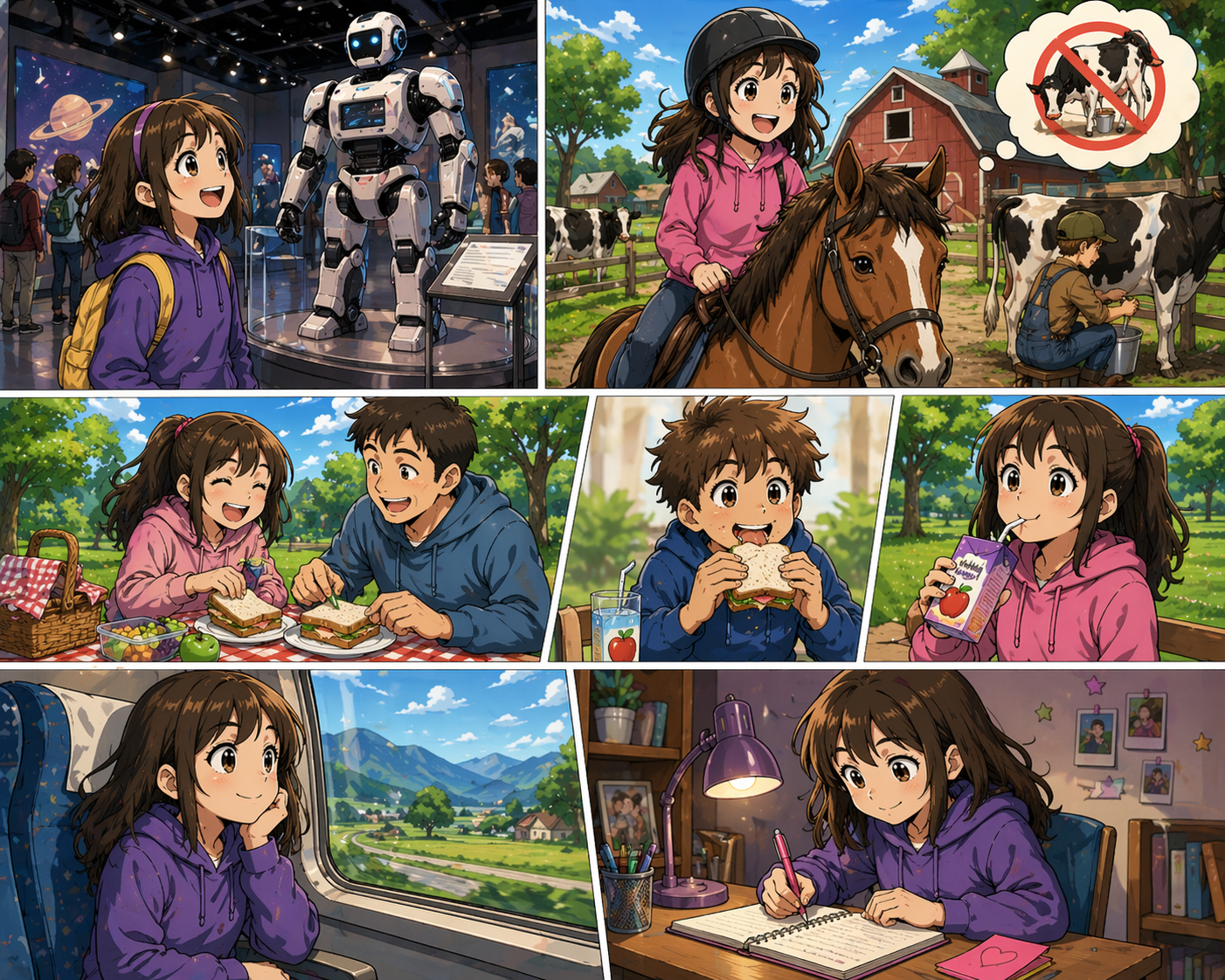 Marta has had a busy month. She has been to a science museum with her school and has seen a robot show there. She has also gone to a farm with her cousins. At the farm, she has ridden a horse for the first time, but she has never milked a cow. On Saturday, Marta has made sandwiches with her dad and has taken them to the park. Her brother Leo has eaten two sandwiches and has drunk apple juice. Marta has never travelled by plane, but she has travelled by train many times. She has written about her month in her notebook.