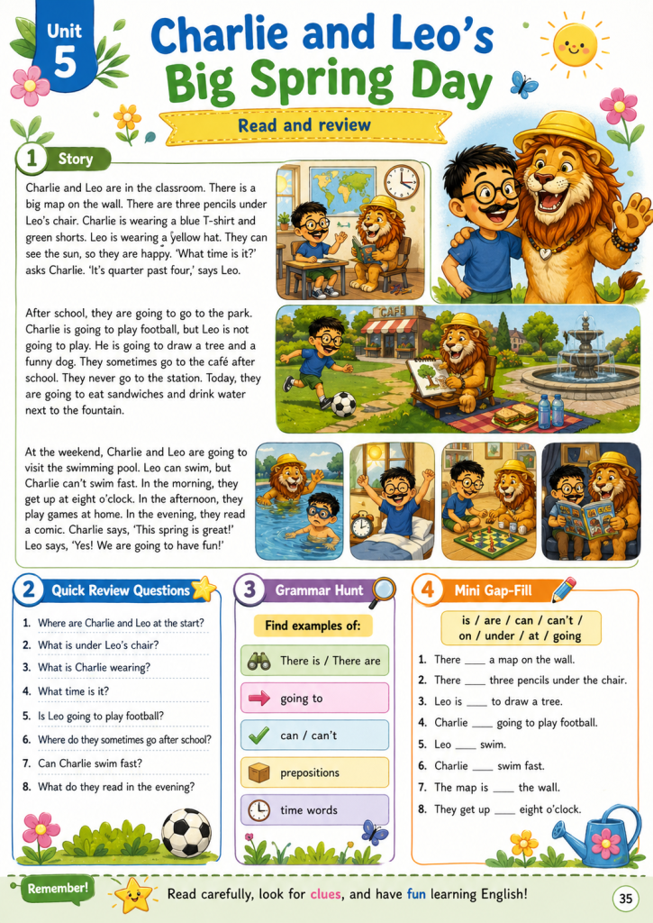 Charlie and Leo are in the classroom. There is a big map on the wall. There are three pencils under Leo’s chair. Charlie is wearing a blue T-shirt and green shorts. Leo is wearing a yellow hat. They can see the sun, so they are happy. “What time is it?” asks Charlie. “It’s quarter past four,” says Leo.